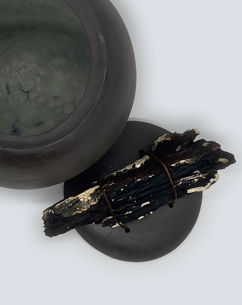 Kombinationen af det sorte stentøjsler og den smukke gren, giver et interessant samspil. En uventet opmærksomhed til en gren, som man ellers blot ville passere i skovbunden. Et lille øjebliksbillede af et træ der var en gang… og en tanke til naturens forunderlighed.