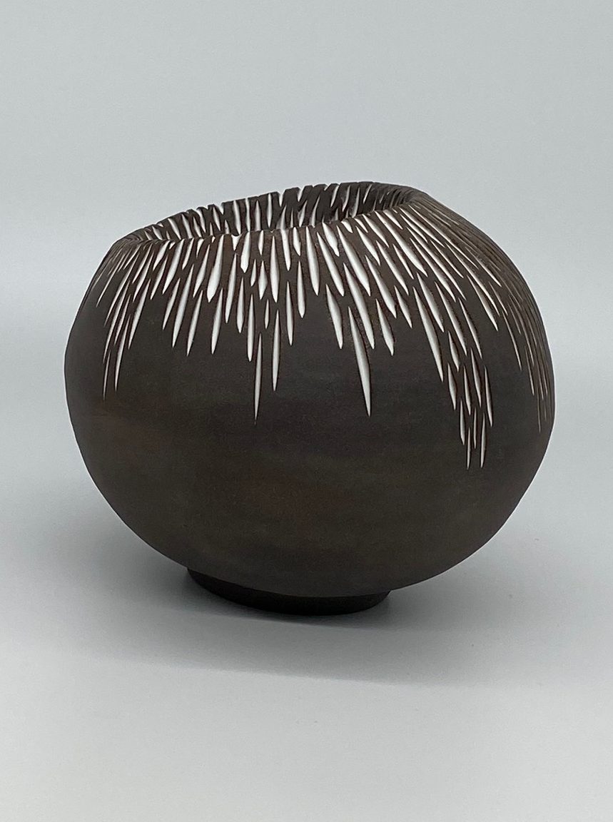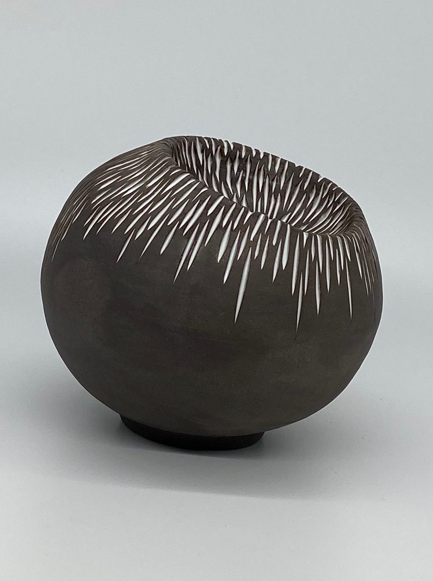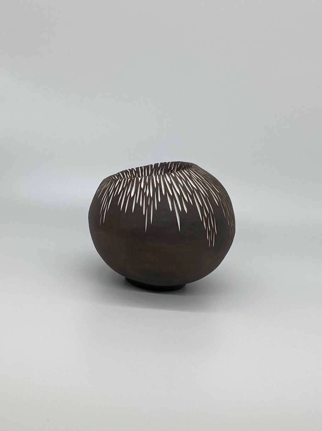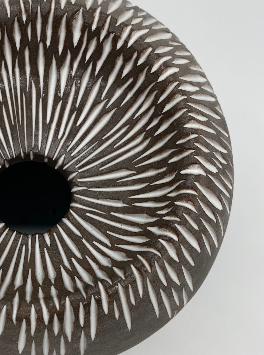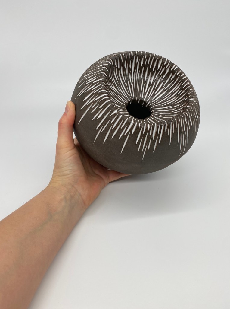 Effekten med det udskårne mønster med hvid glasur, får åbningen i vasen til at virke som et sort hul der trækker alt til sig Effekten med det udskårne mønster med hvid glasur, får åbningen i vasen til at virke som et sort hul der trækker alt til sig; et indadgående kollaps.